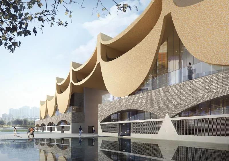 該館的整體建筑構思提取隋唐建筑的剖面輪廓特征,遠看如同一座唐代宮殿群的天際線。室內通過結構空間一體化的混凝土拱券形成了豐富的層次、暗示了“運河橋”的母題。屋面與墻體融合在一起,輔以青磚、清水混凝土等元素,使該博物館更具藝術氛圍和洛陽特色。
